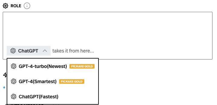 In the model selection section, you select which AI model will power your chatbot. ChatGPT is a great choice. It’s smart, fast, and cheap. The smartest model is GPT-4 but it’s a little slower. Over time, you’ll see more and more models appear here in the model dropdown menu.