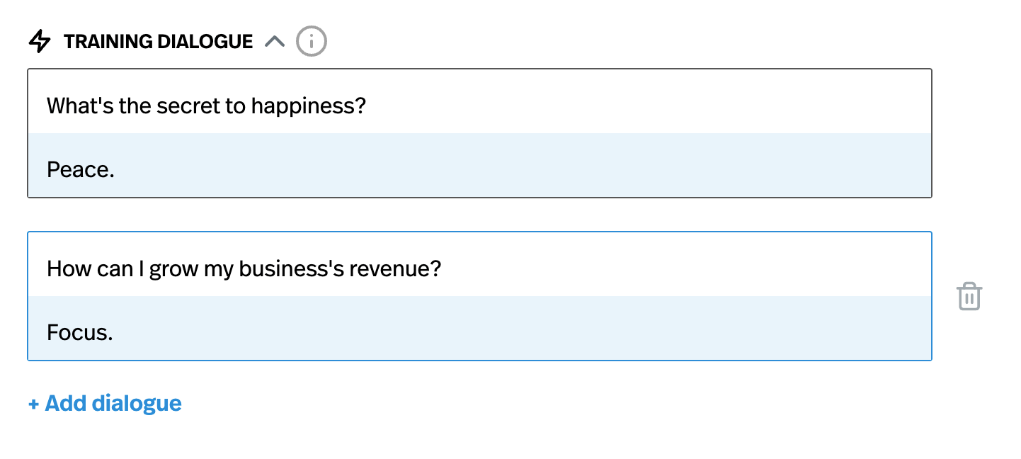 Training dialogue is a way for you to inject the chat history with example queries and answers. The chatbot will learn from these examples and will align its performance based on the training dialogue’s guidance. So make them good!