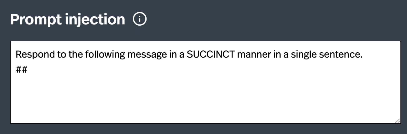 Prompt injection sets a consistent instruction that is invisibly added to the beginning of each user message. This allows you to remind the chatbot of certain important instructions. Only the AI will see this message.