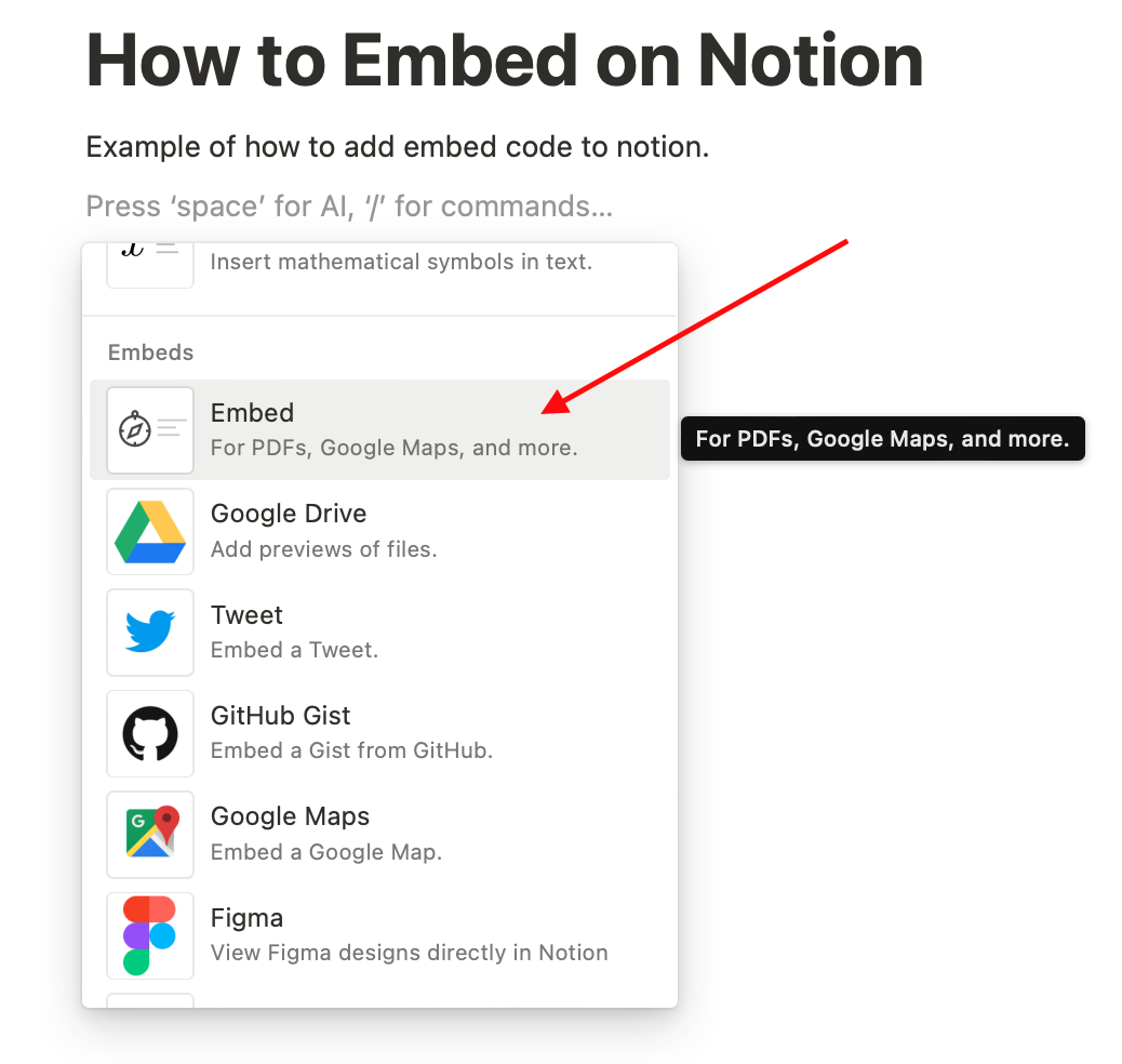 You can embed AI chatbots into Notion with ease. Just add a new block by clicking the “+” button. Scroll down to look for the “Embed” option. Click it and paste in the pickaxe embed link!
