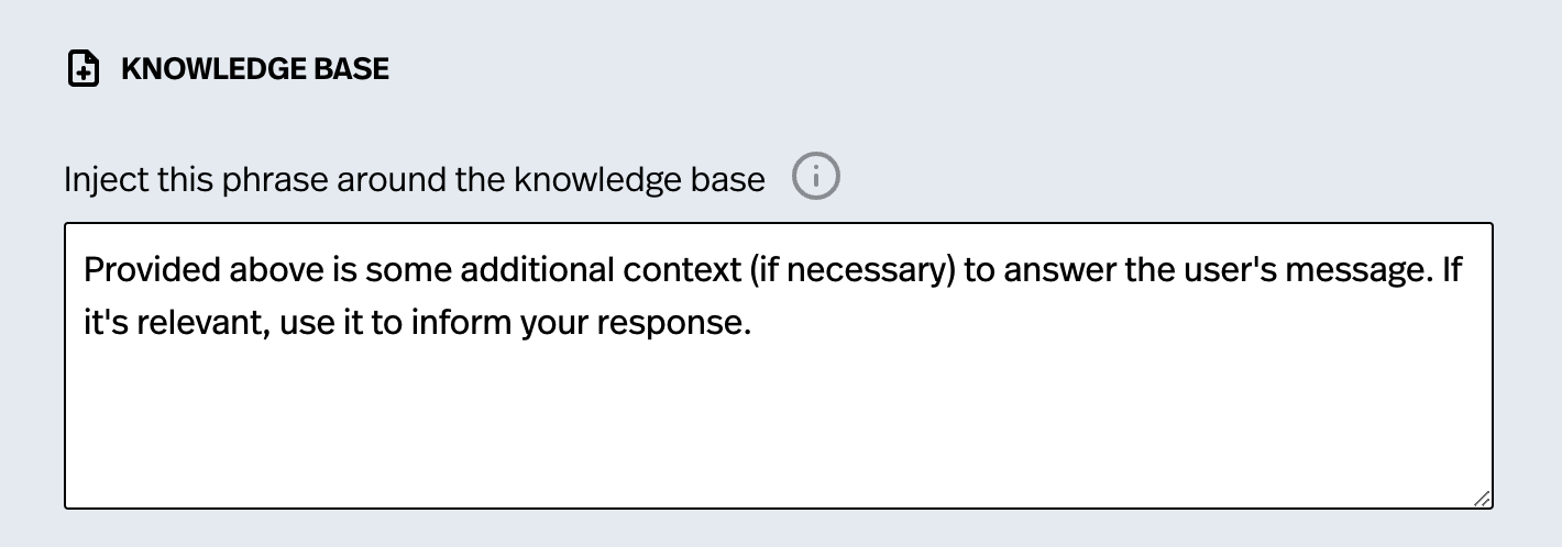 The concept of "framing" the chunks is pretty simple. When the "chunks" are returned to the model, it is also given a simple instruction on how to interpret the chunks. The chatbot will receive the phrase followed by all the relevant chunks that were found. We've put in a robust default phrase already, but you may want to change it for more precise control. For example, you can tell the chatbot that chunk is from the U.S. Tax Code. Or you might want to tell the model something very specfic about the data