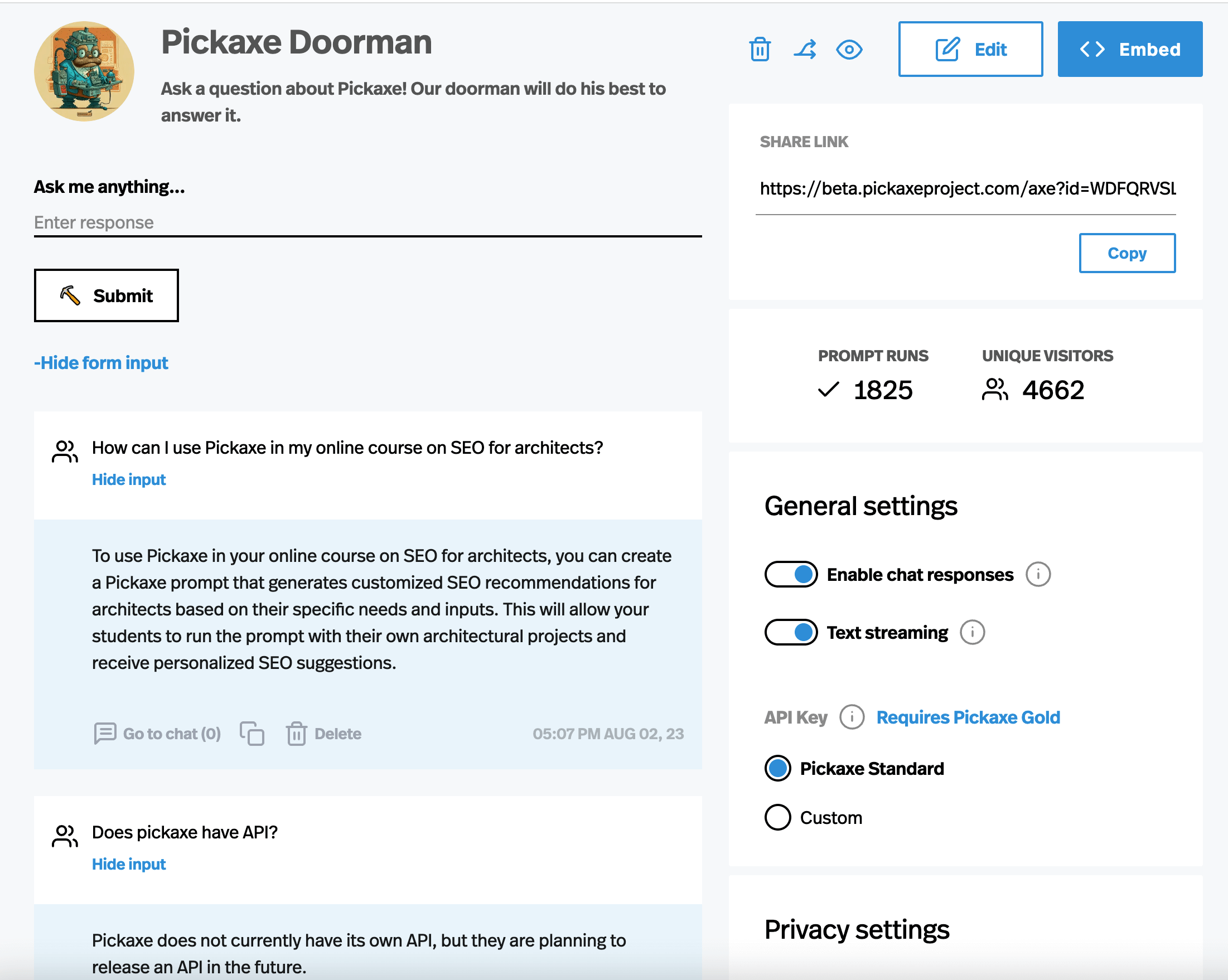 Pickaxe is a great way to publish your prompt as a usable app without exposing the prompt to users. You can share your prompt with friends, co-workers, customers, and online communities who can all use it. Then you can visit a dashboard to view all the usage-- both the inputs people gave your prompt and the outputs your prompt produced. With this knowledge, you can more deliberately iterate on your prompt to move it closer to a desired behavior.