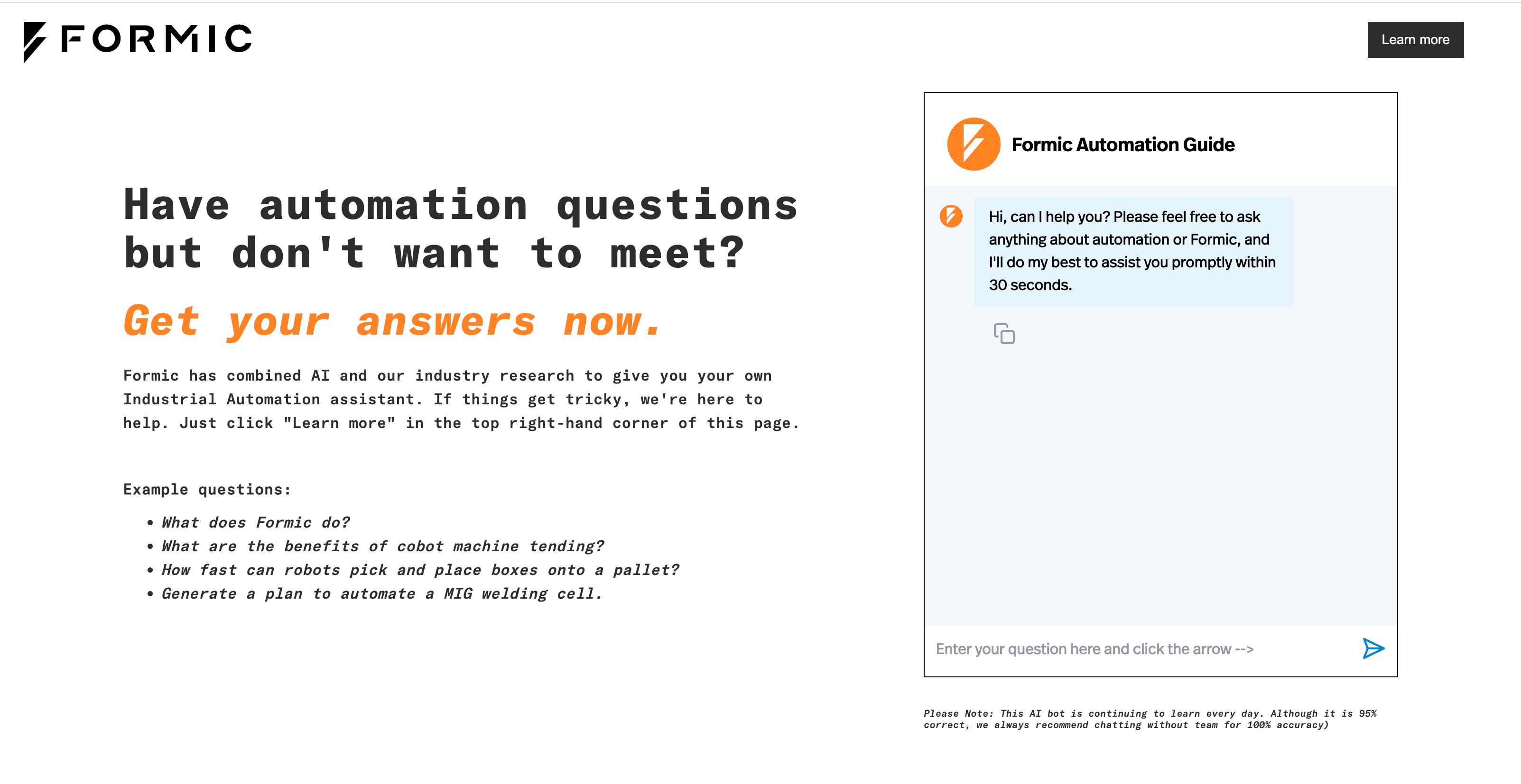 For example, robotics automation provider Formic uses a chatbot to answer customer questions about their products.