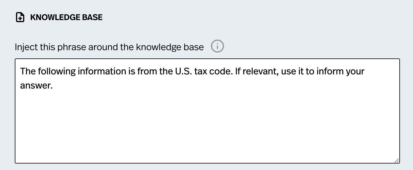 The concept of "framing" the chunks is pretty simple. When the "chunks" are returned to the model, it is also given a simple instruction on how to interpret the chunks. The chatbot will receive the phrase followed by all the relevant chunks that were found. We've put in a robust default phrase already, but you may want to change it for more precise control. For example, you can tell the chatbot that chunk is from the U.S. Tax Code. Or you might want to tell the model something very specfic about the data